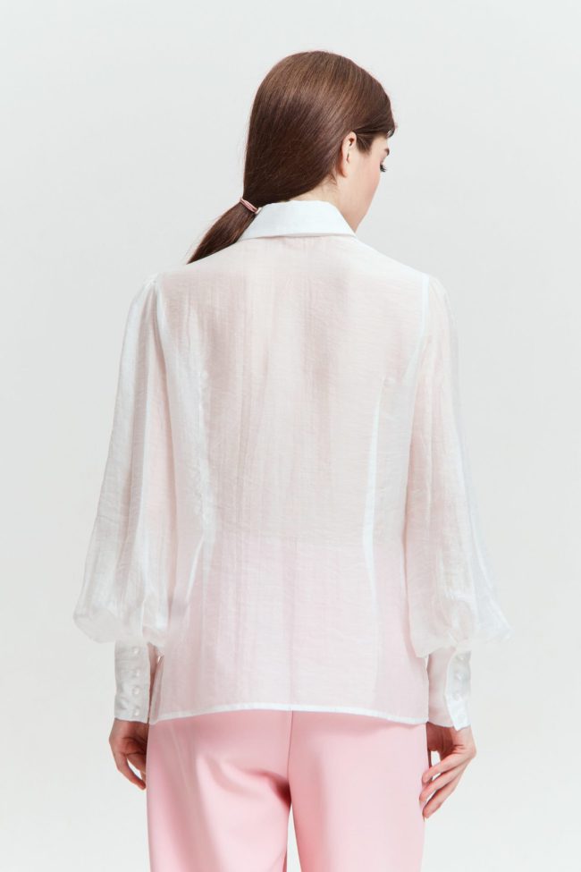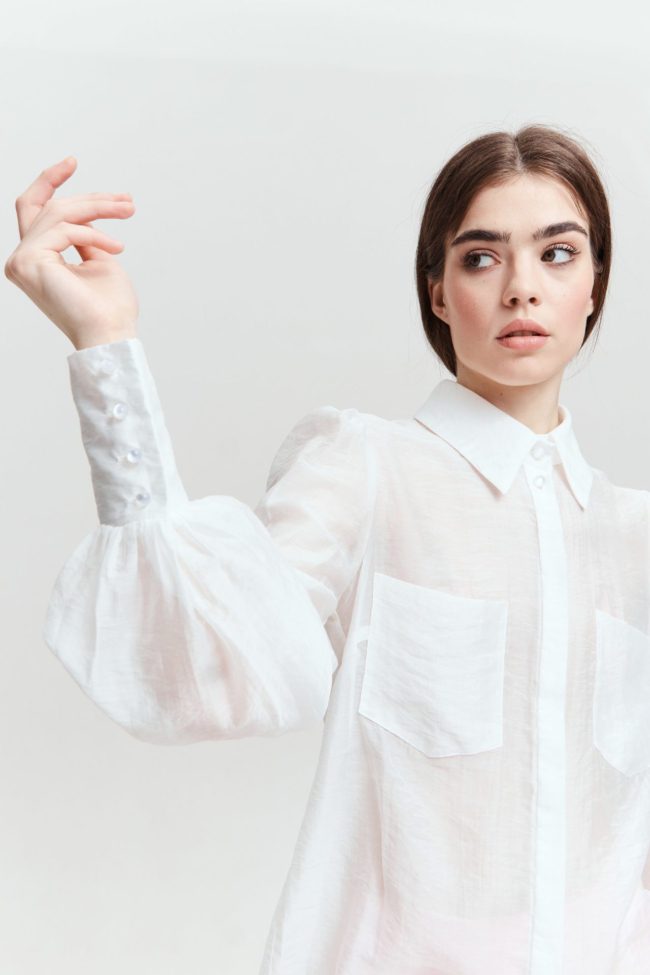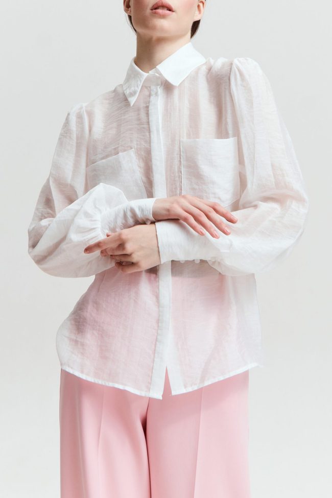 Молочная полупрозрачная блуза из коллекции VERESK label, которая впишется как в повседневный, так и в вечерний образ. Для пошива выбрали итальянский материал на основе тенсела с неоднородной фактурой. Детали: потайная застежка, объёмные рукава, широкие манжеты и круглые пуговицы с благородным переливом.
