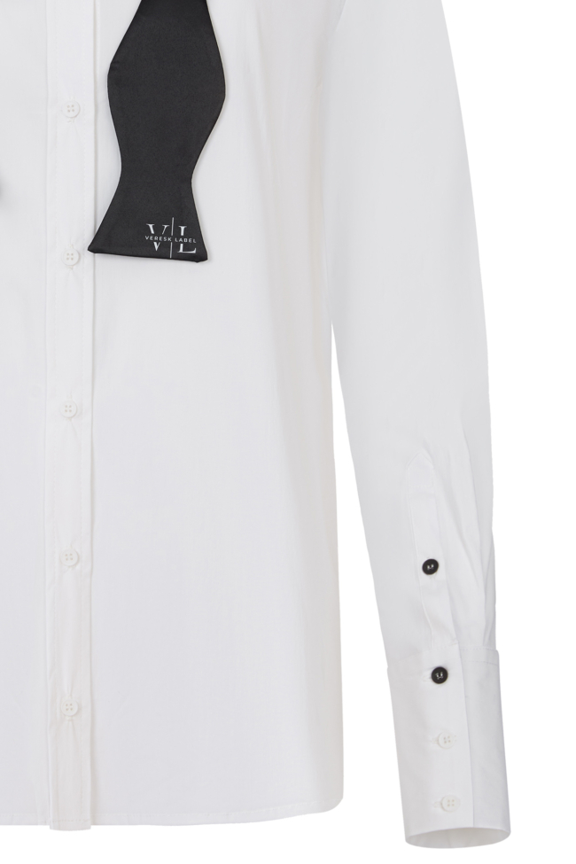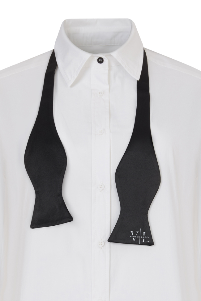 Рубашку свободного силуэта с бантовой складкой на спинке сшили из хлопкового поплина. Широкие манжеты перенесли вперед, чтобы подчеркнуть неформальный стиль. В роли главного акцента – развязанная шелковая черная бабочка с логотипом бренда (можно носить и в завязанном виде).
