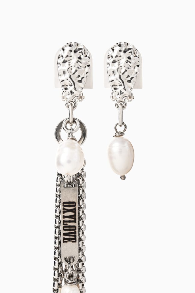 Женственные и эффектные асимметричные серьги-клипсы OXYLOVE Гранж. Собраны ювелиром Окси вручную из цепочек разной длины, жемчуга и брендированного удлиненного подвеса прямоугольной формы. Замок – клипсы с силиконовой насадкой (гипоаллергенные).
