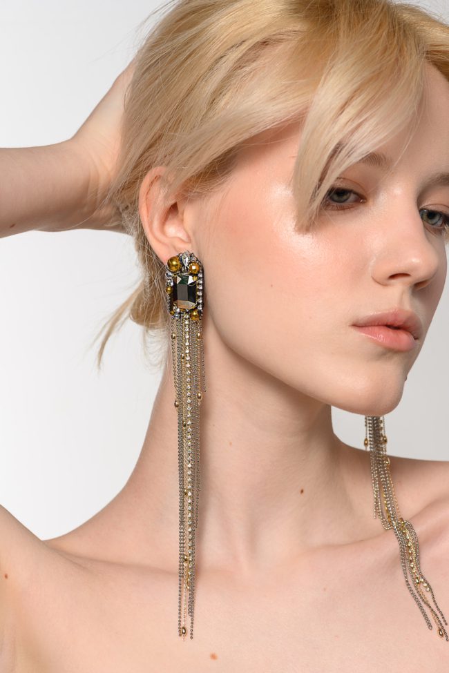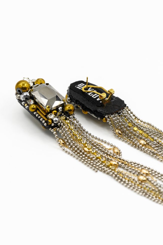 Женственные и эффектные симметричные серьги OXYLOVE Miranda gold. Швензы собраны ювелиром Окси вручную и вышиты камнями Swarovski, гематитом и бусинами из стекла. Модель дополнена подвесками из каскада цепей, которые реагируют на каждое движение. Замок – гвоздик и клипса с силиконовой насадкой (гипоаллергенная). Товар является бижутерией.