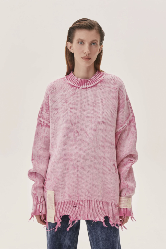 Модель выделяется объёмным силуэтом с опущенными петлями и необработанным краем, что подчёркивает расслабленный стиль и творческий подход к дизайну. Изделие окрашено вручную в технике acid wash: эффект выцветания и уникальной текстуры делает каждый экземпляр отличным от других.