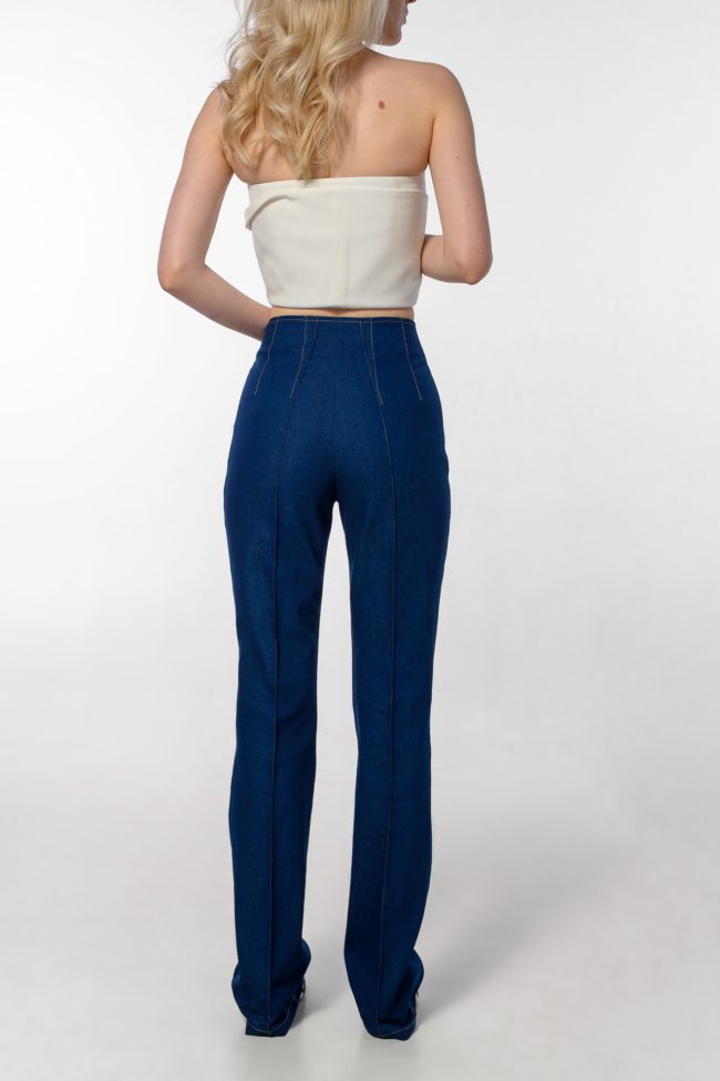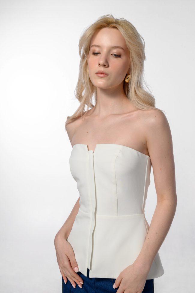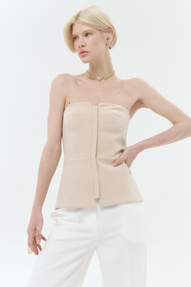 Топ с корсетной основой и скульптурной баской может стать основой чувственного образа. Для пошива выбрали эластичную ткань, которая не мнется и хорошо держит форму. Модель застёгивается молнией, скрытой аккуратной планкой спереди.