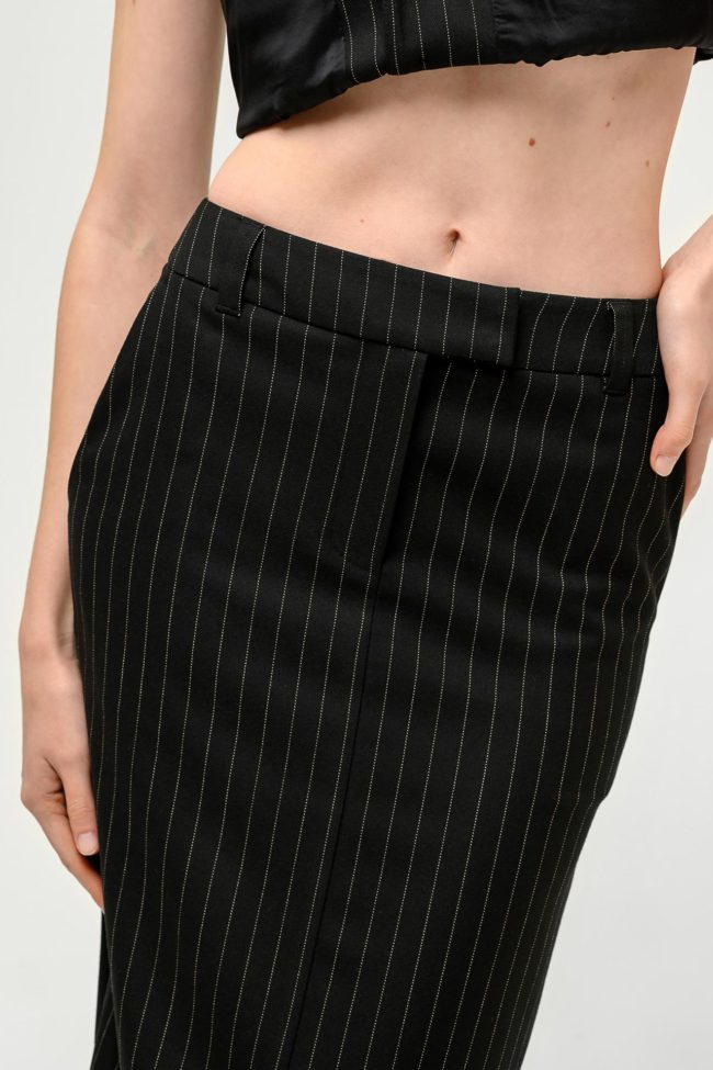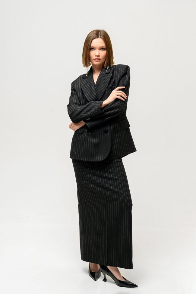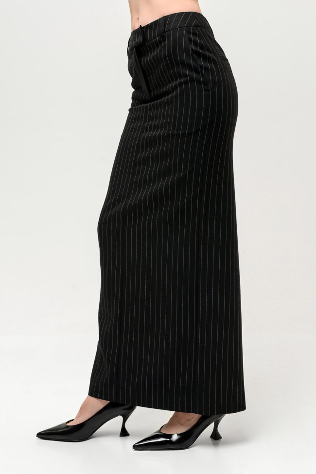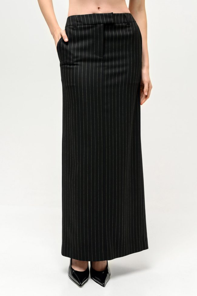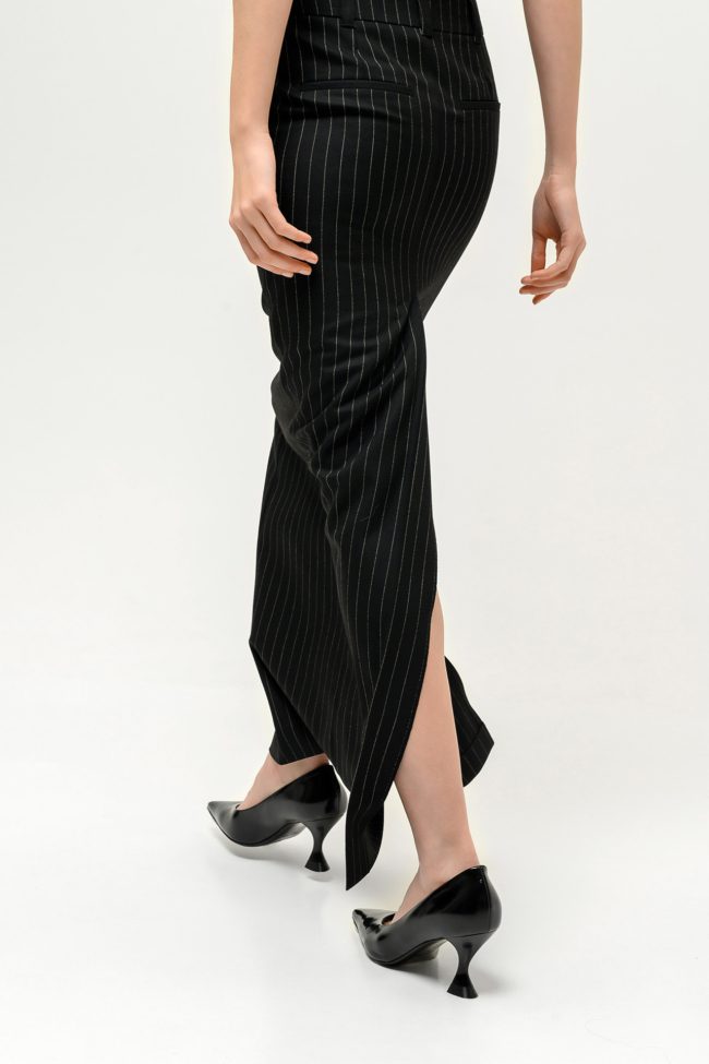 Длинная юбка  из костюмной серии V|L. Высокий разрез сзади снижает градус лаконичности изделия и не дает сковывать шаг при ходьбе. Для пошива модели использовали плотную ткань, которая хорошо держит форму и не мнется. Предлагаем сочетать изделие с жилетом и пиджаком в тон.