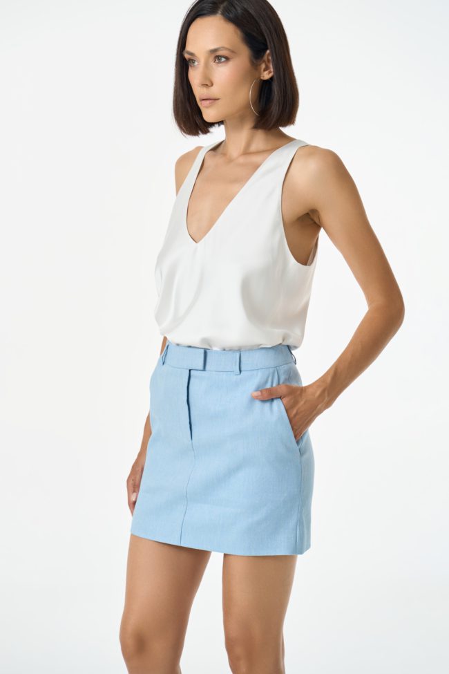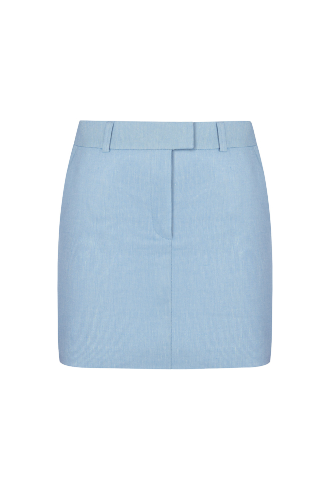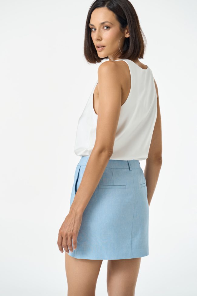 Мини юбку из весенне-летней коллекции V|L скроили по лекалам классических брюк, сохранив пояс с фиксацией на крючки, боковые карманы сбоку и планки карманов сзади. Для пошива использовали премиальную ткань, в составе которой хлопок и лен.
