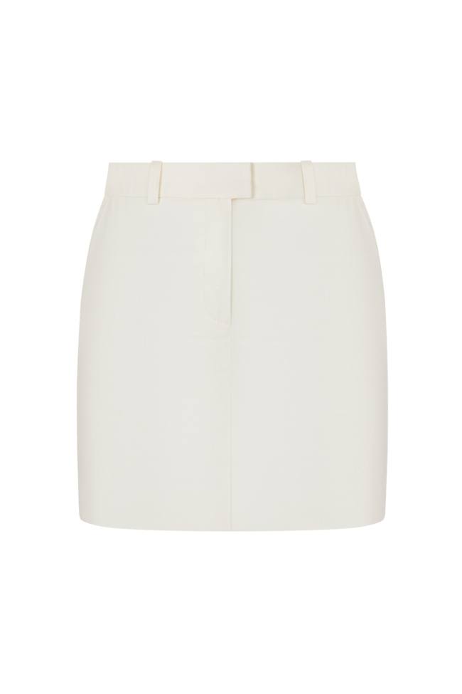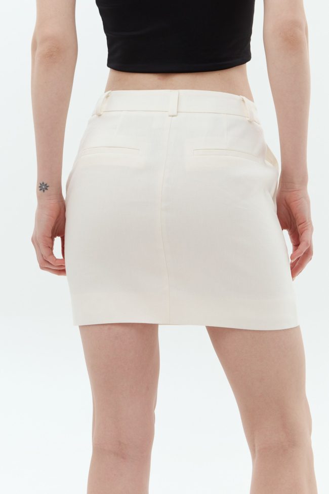 Мини юбку из весенне-летней коллекции V|L скроили по лекалам классических брюк, сохранив пояс с фиксацией на крючки, боковые карманы сбоку и планки карманов сзади. Для пошива использовали премиальную ткань, в составе которой хлопок и лен.
